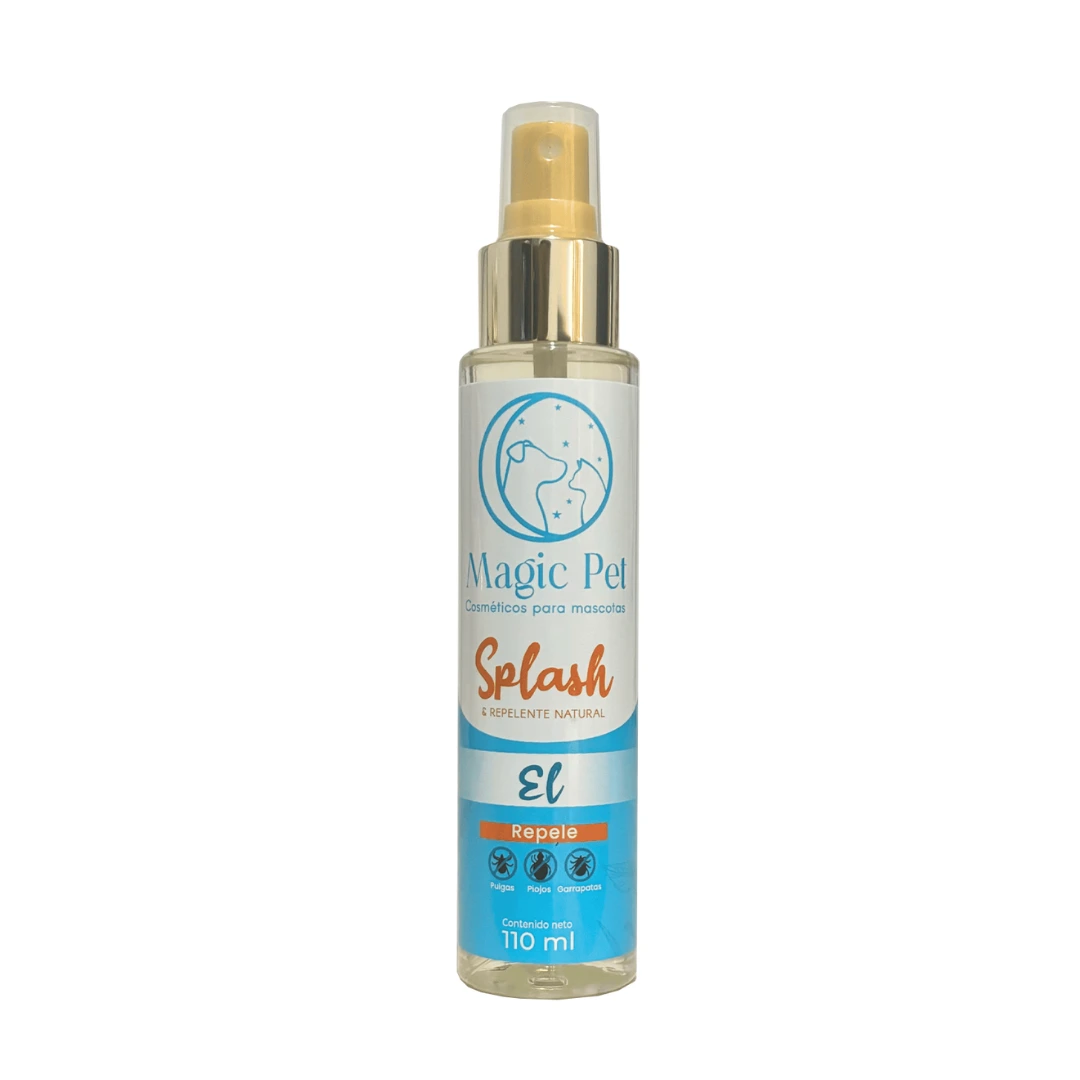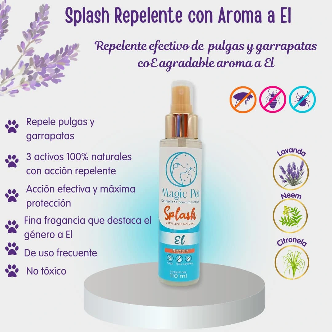 Dale a tu mascota frescura, protección y un aroma irresistible. El Splash Repelente aroma a El de Magic Pet está formulado con extractos naturales de Neem, Citronela y Lavanda, que ayudan a repeler pulgas, piojos y garrapatas de forma natural, mientras cuidan el pelaje de tu perro o gato.
